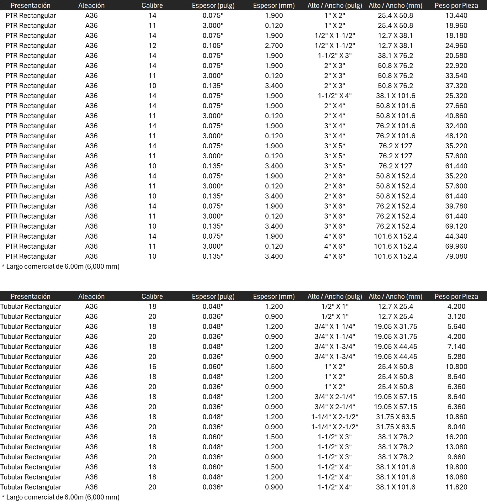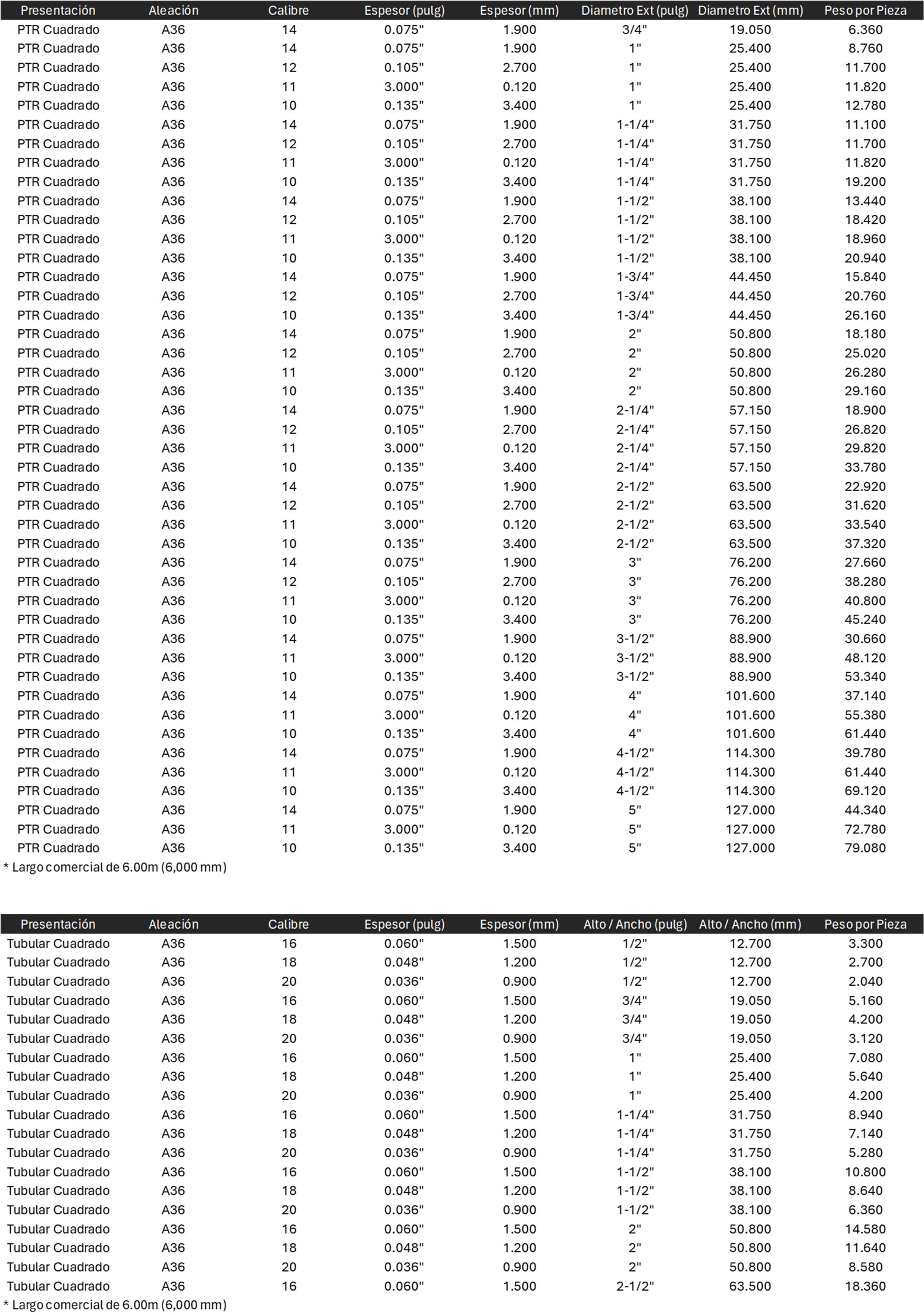 El PTR Estructural (Cuadrado y Rectangular) comúnmente utilizada para armar estructuras, barandales, marcos, implementos agrícolas, etc.